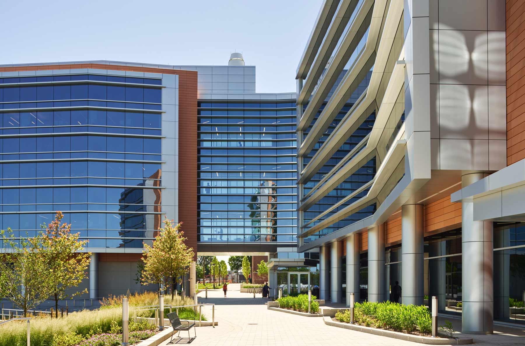 Designed with sustainability in mind, the building is pursuing LEED Gold certification and features a transparent bridge that connects it to neighboring facilities, fostering collaboration and integration within the campus.